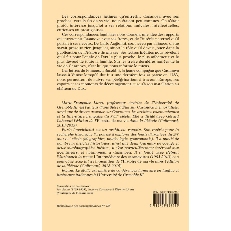 Marie-Françoise Luna, professeur émérite de l’Université de Grenoble III, est l’auteur d’une thèse d’Etat sur Casanova mémorialiste, ainsi que de divers travaux sur Casanova, les archives casanoviennes et la littérature française du XVIIIe siècle. Elle a dirigé avec Gérard Lahouati l’édition de l’Histoire de ma vie dans la Pléiade (Gallimard, 2013-2015).