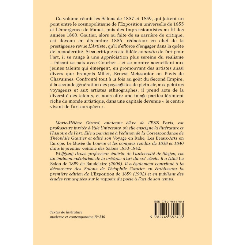 Ce volume réunit les Salons de 1857 et 1859, qui jettent un pont entre le cosmopolitisme de l’Exposition universelle de 1855 et l’émergence de Manet, puis des Impressionnistes au fil des années 1860. Gautier, alors au faîte de sa carrière de critique, est devenu en décembre 1856, rédacteur en chef de la prestigieuse revue L’Artiste, qu’il s’efforce d’engager dans la quête de la modernité. Si sa critique reste fidèle au motto de l’art pour l’art, il se range à une appréciation plus sereine du réalisme – faisant sa paix avec Courbet – et se montre accueillant aux jeunes talents qui émergent, en promouvant des artistes aussi divers que François Millet, Ernest Meissonier ou Puvis de Chavannes. Confronté tout à la fois au goût du Second Empire, à la seconde génération des paysagistes de plein air, aux peintres voyageurs et aux artistes ethnographes, il prend acte de la diversité des talents, et nous offre une image particulièrement riche du monde artistique, dans une capitale devenue « le centre vivant de l’art européen ».