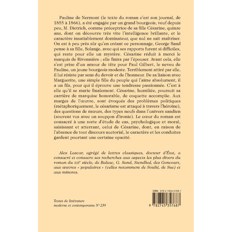 Pauline de Nermont (le texte du roman c’est son journal, de 1855 à 1866), a été engagée par un grand bourgeois, veuf depuis peu, M. Dietrich, comme préceptrice de sa fille Césarine, quinze ans, dont on découvre très vite l’intelligence brillante, et le caractère insatiablement dominateur, que nul ne sait maîtriser. On est à peu près sûr qu’en créant ce personnage, George Sand pense à sa fille, Solange, avec qui ses rapports furent si difficiles, qui reste pour elle un mystère. Césarine réduit à merci le marquis de Rivonnière ; elle finira par l’épouser. Avant cela, elle s’est prise d’un amour de tête pour Paul Gilbert, le neveu de Pauline, un jeune bourgeois modeste. Terriblement attiré par elle, il lui résiste par sens du devoir et de l’honneur. De sa liaison avec Marguerite, une simple fille du peuple qui l’aime absolument, il a un fils, pour qui il éprouve une tendresse passionnée. C’est à elle qu’il se marie finalement. Césarine, humiliée, poursuit sa carrière de marquise honorable, de coquette accomplie. Aux marges de l’œuvre, sont évoqués des problèmes politiques (métaphoriquement, le césarisme est attaqué à travers l’héroïne), des questions de mœurs, des types neufs dans l’univers sandien (souvent vus avec un soupçon d’ironie). Le cœur du roman est consacré à une sorte d’étude de cas, psychologique et moral, saisissant et atterrant, celui de Césarine, dont, en raison de l’absence de tout discours auctorial, le caractère et les conduites gardent pourtant une certaine opacité.