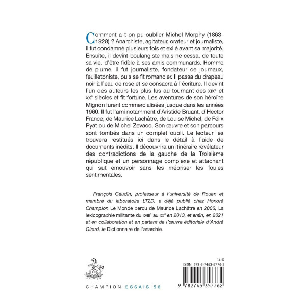 Comment a-t-on pu oublier Michel Morphy (1863-1928) ? Anarchiste, agitateur, orateur et journaliste, il fut condamné plusieurs fois et exilé avant sa majorité. Ensuite, il devint boulangiste mais ne cessa, de toute sa vie, d’être fidèle à ses amis communards. Homme de plume, il fut journaliste, fondateur de journaux, feuilletoniste, puis se fit romancier. Il passa du drapeau noir à l’eau de rose et se consacra à l’écriture. Il devint l’un des auteurs les plus lus au tournant des XIXe et XXe siècles et fit fortune. Les aventures de son héroïne Mignon furent commercialisées jusque dans les années 1960. Il fut l’ami notamment d’Aristide Bruant, d’Hector France, de Maurice Lachâtre, de Louise Michel, de Félix Pyat ou de Michel Zevaco. Son œuvre et son parcours sont tombés dans un complet oubli. Le lecteur les trouvera restitués ici dans le détail à l’aide de documents inédits. Il découvrira un itinéraire révélateur des contradictions de la gauche de la Troisième république et un personnage complexe et attachant qui sut émouvoir sans les mépriser les foules sentimentales.