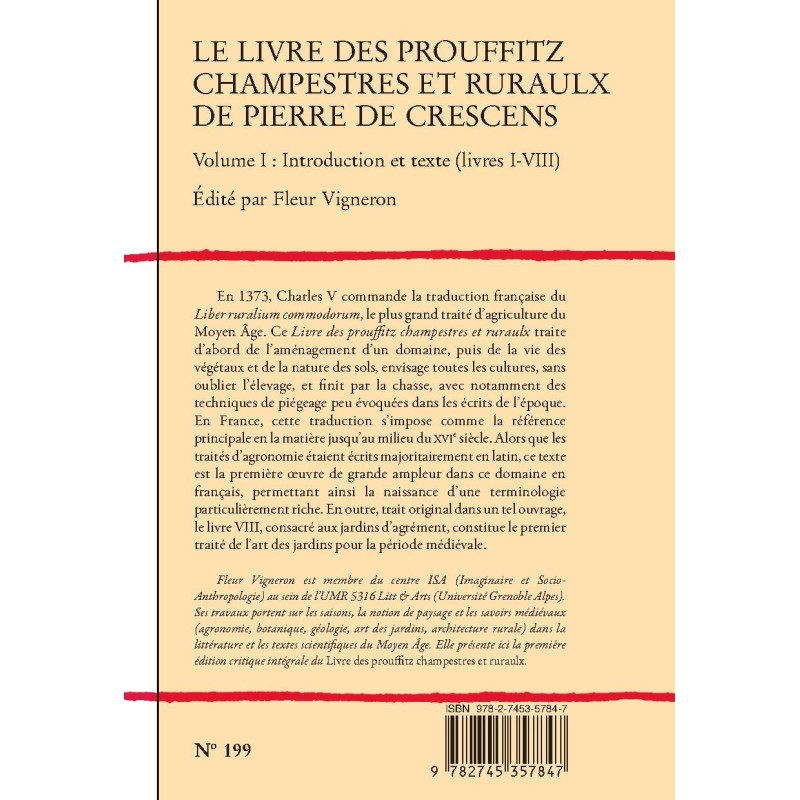 Fleur Vigneron est membre du centre ISA (Imaginaire et Socio- Anthropologie) au sein de l’UMR 5316 Litt & Arts (Université Grenoble Alpes). Ses travaux portent sur les saisons, la notion de paysage et les savoirs médiévaux (agronomie, botanique, géologie, art des jardins, architecture rurale) dans la littérature et les textes scientifiques du Moyen Âge. Elle présente ici la première édition critique intégrale du Livre des prouffitz champestres et ruraulx.