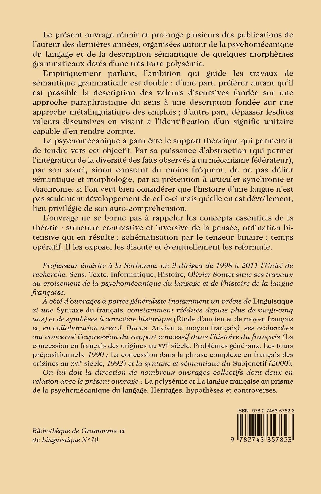Le présent ouvrage réunit et prolonge plusieurs des publications de l’auteur des dernières années, organisées autour de la psychomécanique du langage et de la description sémantique de quelques morphèmes grammaticaux dotés d’une très forte polysémie.