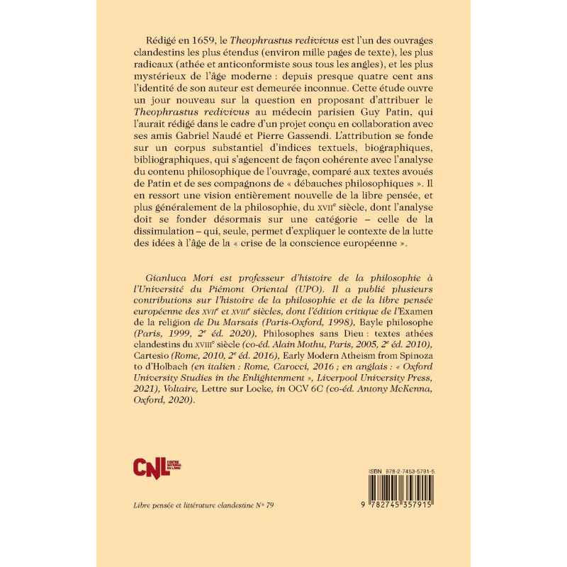 Rédigé en 1659, le Theophrastus redivivus est l’un des ouvrages clandestins les plus étendus (environ mille pages de texte), les plus radicaux (athée et anticonformiste sous tous les angles), et les plus mystérieux de l’âge moderne : depuis presque quatre cent ans l’identité de son auteur est demeurée inconnue. Cette étude ouvre un jour nouveau sur la question en proposant d’attribuer le Theophrastus redivivus au médecin parisien Guy Patin, qui l’aurait rédigé dans le cadre d’un projet conçu en collaboration avec ses amis Gabriel Naudé et Pierre Gassendi. L’attribution se fonde sur un corpus substantiel d’indices textuels, biographiques, bibliographiques, qui s’agencent de façon cohérente avec l’analyse du contenu philosophique de l’ouvrage, comparé aux textes avoués de Patin et de ses compagnons de « débauches philosophiques ». Il en ressort une vision entièrement nouvelle de la libre pensée, et plus généralement de la philosophie, du XVIIe siècle, dont l’analyse doit se fonder désormais sur une catégorie – celle de la dissimulation – qui, seule, permet d’expliquer le contexte de la lutte des idées à l’âge de la « crise de la conscience européenne »