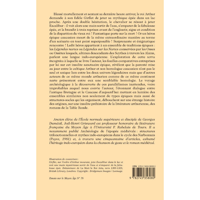 Blessé mortellement et sentant sa dernière heure arriver, le roi Arthur demande à son fidèle Girflet de jeter sa mythique épée dans un lac proche. Après une double hésitation, le chevalier se résout à jeter Excalibur : il voit alors une main sortir de l’eau, s’emparer de la fabuleuse épée, et la brandir à trois reprises avant de l’engloutir, signe et condition de la disparition du vieux roi ! Fantastique porte sur la mort ! Or un héros épique caucasien meurt de la même extraordinaire manière au terme d’un scénario en tout point superposable ! Surprenante et énigmatique rencontre ! Ledit héros appartient à un ensemble de traditions épiques : les Légendes nartes ou Légendes sur les Nartes conservées par les Osses ou Ossètes lesquels, ultimes descendants des Scythes à travers les Alains, parlent une langue indo-européenne. L’exploration de cette terra incognita à laquelle se livre l’auteur, les fouilles comparatives entreprises par lui sur cet insolite sanctuaire épique, révèlent que la parenté mise au jour entre le celtique Arthur et son homologue caucasien n’est pas le seul et unique lien entre les deux univers légendaires mais que d’autres acteurs de ce même monde arthurien comme de ce même continent narte présentent entre eux une semblable homologie. Le voyage archéologique à la découverte de ces parallélismes inattendus, voire improbables auquel nous convie l’auteur, l’étonnant dialogue entre l’antique Bretagne et le Caucase d’aujourd’hui mettant en lumière des ensembles similaires non seulement de types épiques mais aussi de structures-socles qui les organisent, débouchent sur une étrange histoire des origines, sur une insolite préhistoire de la littérature arthurienne, des romans de la Table Ronde.