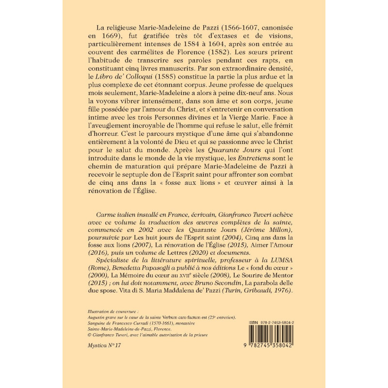 La religieuse Marie-Madeleine de Pazzi (1566-1607, canonisée en 1669), fut gratifiée très tôt d’extases et de visions, particulièrement intenses de 1584 à 1604, après son entrée au couvent des carmélites de Florence (1582). Les sœurs prirent l’habitude de transcrire ses paroles pendant ces rapts, en constituant cinq livres manuscrits. Par son extraordinaire densité, le Libro de’ Colloqui (1585) constitue la partie la plus ardue et la plus complexe de cet étonnant corpus. Jeune professe de quelques mois seulement, Marie-Madeleine a alors à peine dix-neuf ans. Nous la voyons vibrer intensément, dans son âme et son corps, jeune fille possédée par l’amour du Christ, et s’entretenir en conversation intime avec les trois Personnes divines et la Vierge Marie. Face à l’aveuglement incroyable de l’homme qui refuse le salut, elle frémit d’horreur. C’est le parcours mystique d’une âme qui s’abandonne entièrement à la volonté de Dieu et qui se passionne avec le Christ pour le salut du monde. Après les Quarante Jours qui l’ont introduite dans le monde de la vie mystique, les Entretiens sont le chemin de maturation qui prépare Marie-Madeleine de Pazzi à recevoir le septuple don de l’Esprit saint pour affronter son combat de cinq ans dans la « fosse aux lions » et œuvrer ainsi à la rénovation de l’Église.