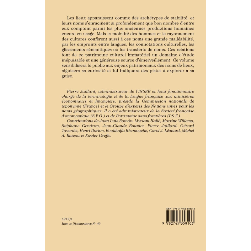 Les lieux apparaissent comme des archétypes de stabilité, et leurs noms s’enracinent si profondément que bon nombre d’entre eux comptent parmi les plus anciennes productions humaines encore en usage. Mais la mobilité des hommes et le rayonnement des cultures confèrent aussi à ces noms une grande malléabilité, par les emprunts entre langues, les connotations culturelles, les glissements sémantiques ou les transferts de noms. Ces relations font de ce patrimoine culturel immatériel un domaine d’étude inépuisable et une généreuse source d’émerveillement. Ce volume sensibilisera le public aux enjeux patrimoniaux des noms de lieux, aiguisera sa curiosité et lui indiquera des pistes à explorer à sa guise.