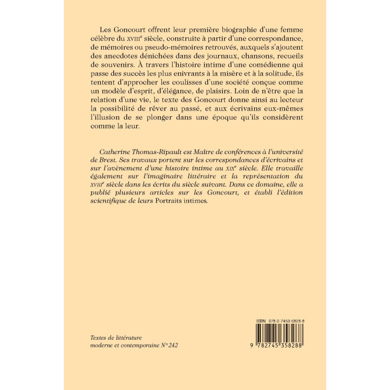 Les Goncourt offrent leur première biographie d’une femme célèbre du XVIIIe siècle, construite à partir d’une correspondance, de mémoires ou pseudo-mémoires retrouvés, auxquels s’ajoutent des anecdotes dénichées dans des journaux, chansons, recueils de souvenirs. À travers l’histoire intime d’une comédienne qui passe des succès les plus enivrants à la misère et à la solitude, ils tentent d’approcher les coulisses d’une société conçue comme un modèle d’esprit, d’élégance, de plaisirs. Loin de n’être que la relation d’une vie, le texte des Goncourt donne ainsi au lecteur la possibilité de rêver au passé, et aux écrivains eux-mêmes l’illusion de se plonger dans une époque qu’ils considèrent comme la leur.