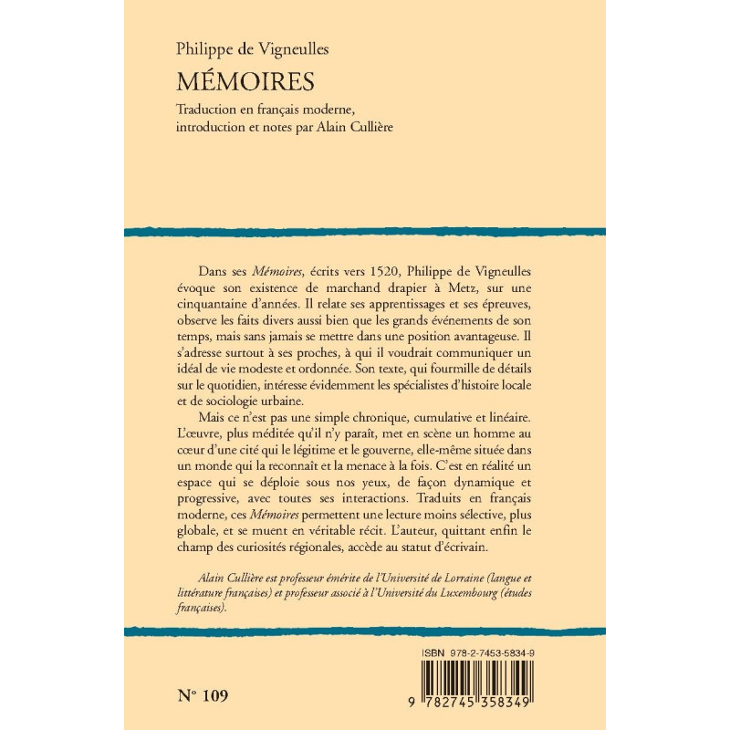 Dans ses Mémoires, écrits vers 1520, Philippe de Vigneulles évoque son existence de marchand drapier à Metz, sur une cinquantaine d’années. Il relate ses apprentissages et ses épreuves, observe les faits divers aussi bien que les grands événements de son temps, mais sans jamais se mettre dans une position avantageuse. Il s’adresse surtout à ses proches, à qui il voudrait communiquer un idéal de vie modeste et ordonnée. Son texte, qui fourmille de détails sur le quotidien, intéresse évidemment les spécialistes d’histoire locale et de sociologie urbaine.