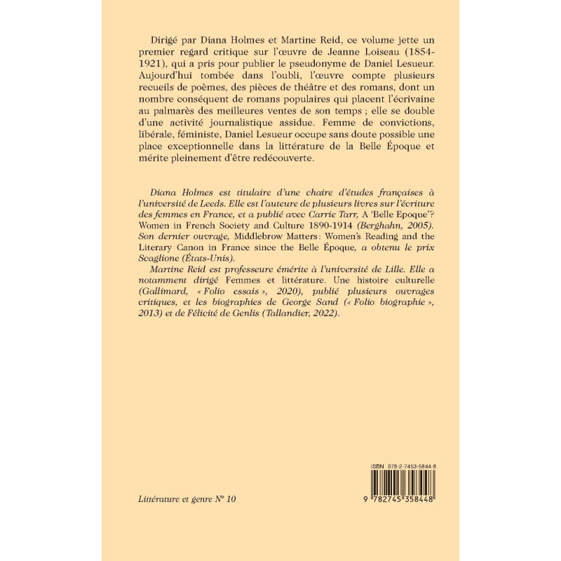 Dirigé par Diana Holmes et Martine Reid, ce volume jette un premier regard critique sur l’œuvre de Jeanne Loiseau (1854- 1921), qui a pris pour publier le pseudonyme de Daniel Lesueur. Aujourd’hui tombée dans l’oubli, l’œuvre compte plusieurs recueils de poèmes, des pièces de théâtre et des romans, dont un nombre conséquent de romans populaires qui placent l’écrivaine au palmarès des meilleures ventes de son temps ; elle se double d’une activité journalistique assidue. Femme de convictions, libérale, féministe, Daniel Lesueur occupe sans doute possible une place exceptionnelle dans la littérature de la Belle Époque et mérite pleinement d’être redécouverte.