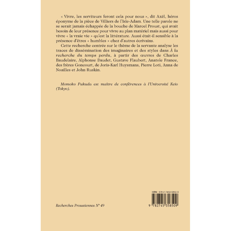 Cette recherche centrée sur le thème de la servante analyse les traces de dissémination des imaginaires et des styles dans À la recherche du temps perdu, à partir des œuvres de Charles Baudelaire, Alphonse Daudet, Gustave Flaubert, Anatole France, des frères Goncourt, de Joris-Karl Huysmans, Pierre Loti, Anna de Noailles et John Ruskin.