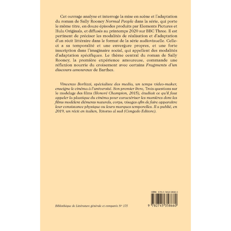 Cet ouvrage analyse et interroge la mise en scène et l’adaptation du roman de Sally Rooney Normal People dans la série, qui porte le même titre, en douze épisodes produits par Elements Pictures et Hulu Originals, et diffusés au printemps 2020 sur BBC Three. Il est pertinent de préciser les modalités de réalisation et d’adaptation d’un récit littéraire dans le format de la série audiovisuelle. Celle-ci a sa temporalité et une envergure propres, et une forte inscription dans l’imaginaire social, qui appellent des modalités d’adaptation spécifiques. Le thème central du roman de Sally Rooney, la première expérience amoureuse, commande une réflexion nourrie du croisement avec certains Fragments d’un discours amoureux de Barthes.