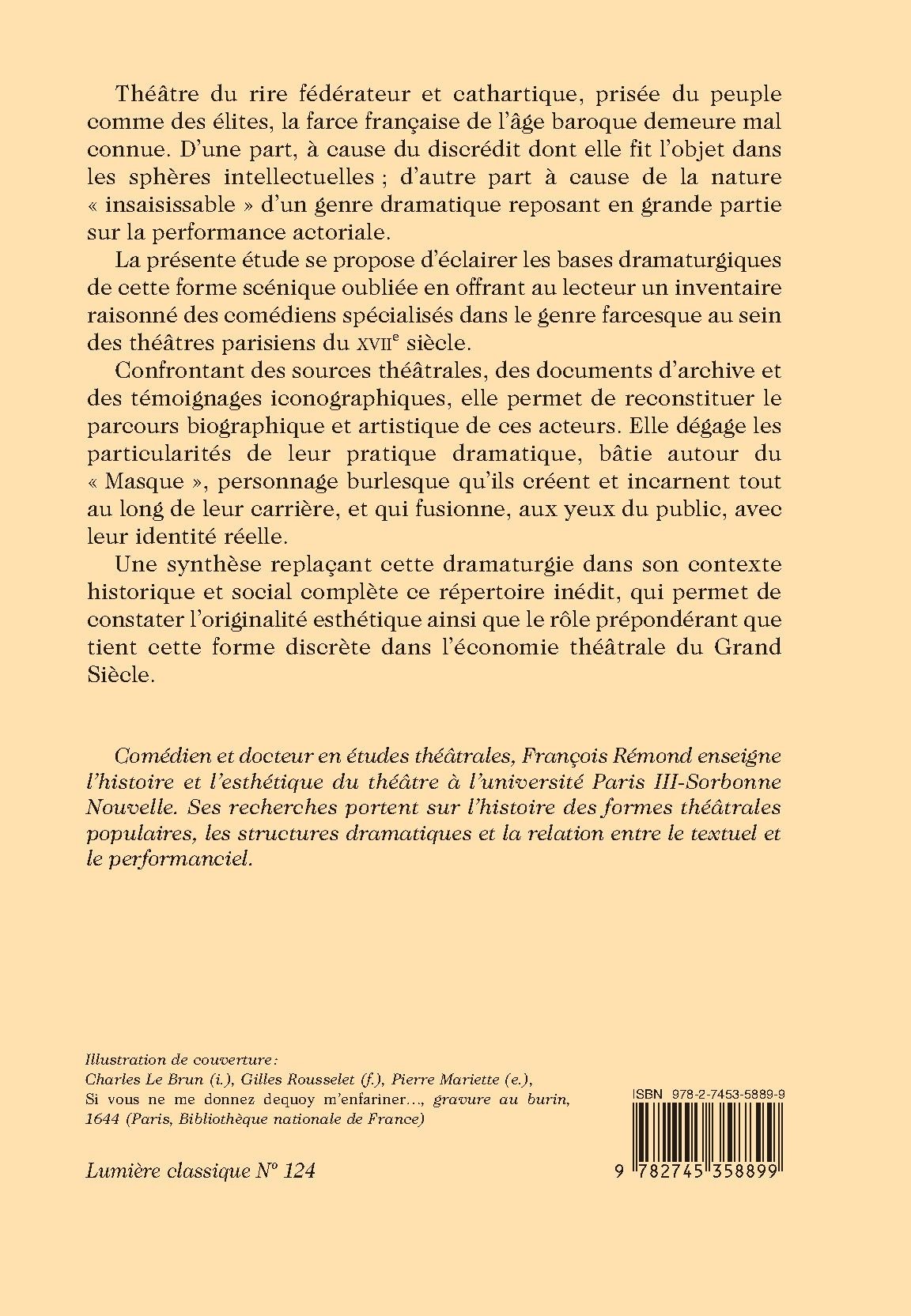 Théâtre du rire fédérateur et cathartique, prisée du peuple comme des élites, la farce française de l’âge baroque demeure mal connue. D’une part, à cause du discrédit dont elle fit l’objet dans les sphères intellectuelles ; d’autre part à cause de la nature « insaisissable » d’un genre dramatique reposant en grande partie sur la performance actoriale.
