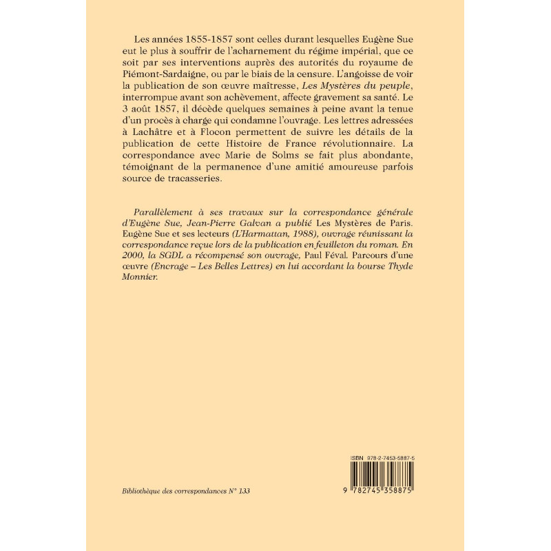 Les années 1855-1857 sont celles durant lesquelles Eugène Sue eut le plus à souffrir de l’acharnement du régime impérial, que ce soit par ses interventions auprès des autorités du royaume de Piémont-Sardaigne, ou par le biais de la censure. L’angoisse de voir la publication de son œuvre maîtresse, Les Mystères du peuple, interrompue avant son achèvement, affecte gravement sa santé. Le 3 août 1857, il décède quelques semaines à peine avant la tenue d’un procès à charge qui condamne l’ouvrage. Les lettres adressées à Lachâtre et à Flocon permettent de suivre les détails de la publication de cette Histoire de France révolutionnaire. La correspondance avec Marie de Solms se fait plus abondante, témoignant de la permanence d’une amitié amoureuse parfois source de tracasseries.