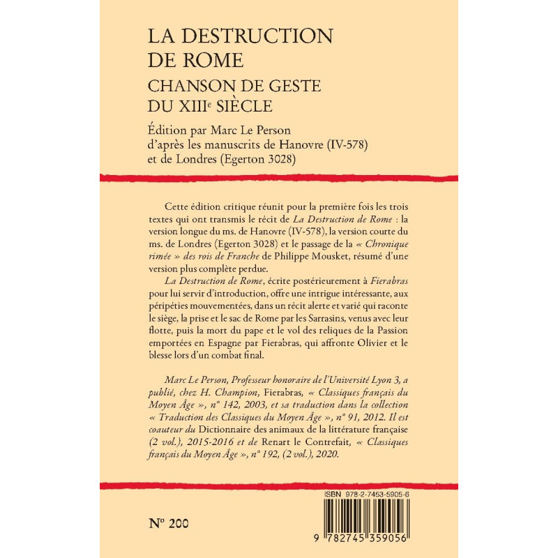 Marc Le Person, Professeur honoraire de l’Université Lyon 3, a publié, chez H. Champion, Fierabras, « Classiques français du Moyen Âge », n° 142, 2003, et sa traduction dans la collection « Traduction des Classiques du Moyen Âge », n° 91, 2012. Il est coauteur du Dictionnaire des animaux de la littérature française (2 vol.), 2015-2016 et de Renart le Contrefait, « Classiques français du Moyen Âge », n° 192, (2 vol.), 2020.