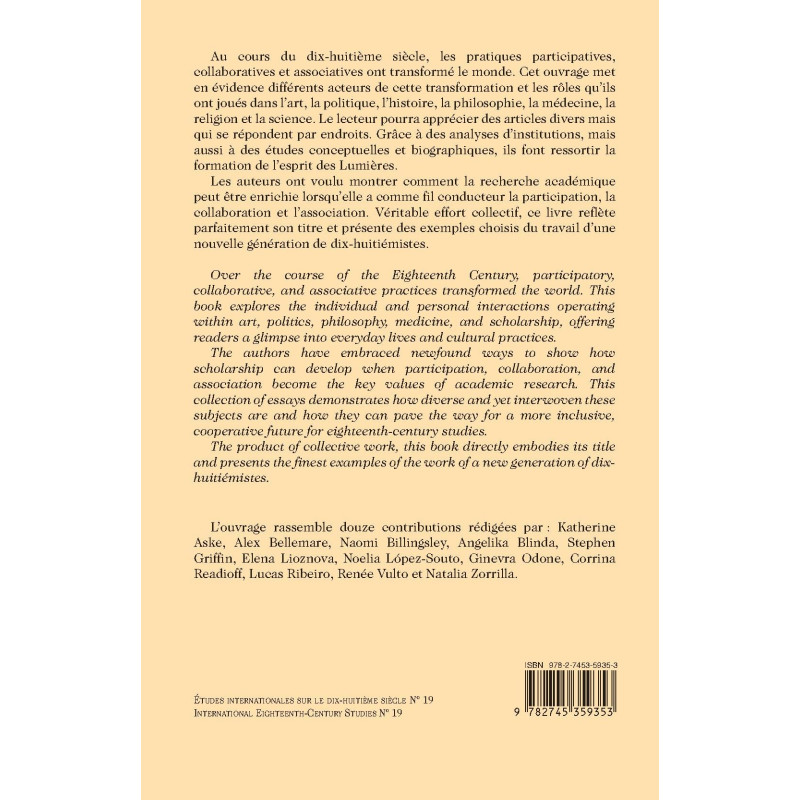 Au cours du dix-huitième siècle, les pratiques participatives, collaboratives et associatives ont transformé le monde. Cet ouvrage met en évidence différents acteurs de cette transformation et les rôles qu’ils ont joués dans l’art, la politique, l’histoire, la philosophie, la médecine, la religion et la science. Le lecteur pourra apprécier des articles divers mais qui se répondent par endroits. Grâce à des analyses d’institutions, mais aussi à des études conceptuelles et biographiques, ils font ressortir la formation de l’esprit des Lumières.
