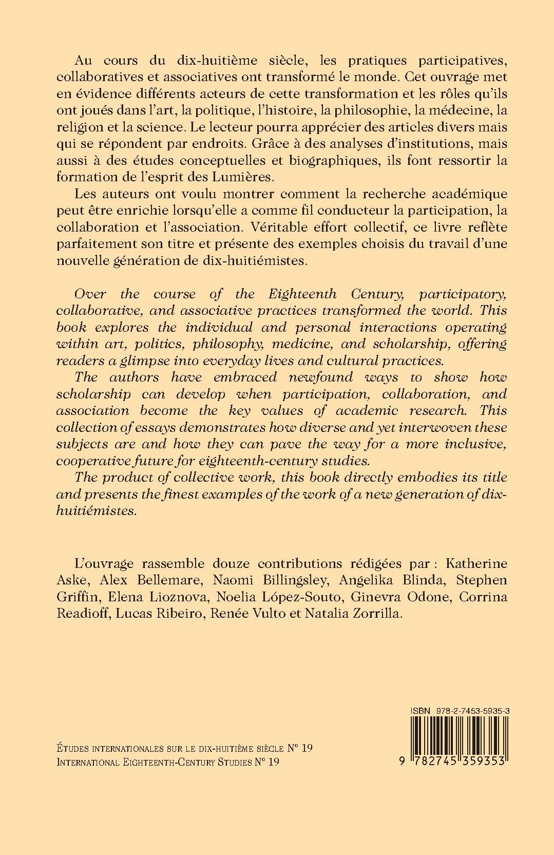 Over the course of the Eighteenth Century, participatory, collaborative, and associative practices transformed the world. This book explores the individual and personal interactions operating within art, politics, philosophy, medicine, and scholarship, offering readers a glimpse into everyday lives and cultural practices. The authors have embraced newfound ways to show how scholarship can develop when participation, collaboration, and association become the key values of academic research. This collection of essays demonstrates how diverse and yet interwoven these subjects are and how they can pave the way for a more inclusive, cooperative future for eighteenth-century studies. The product of collective work, this book directly embodies its title and presents the finest examples of the work of a new generation of dix-huitiémistes.