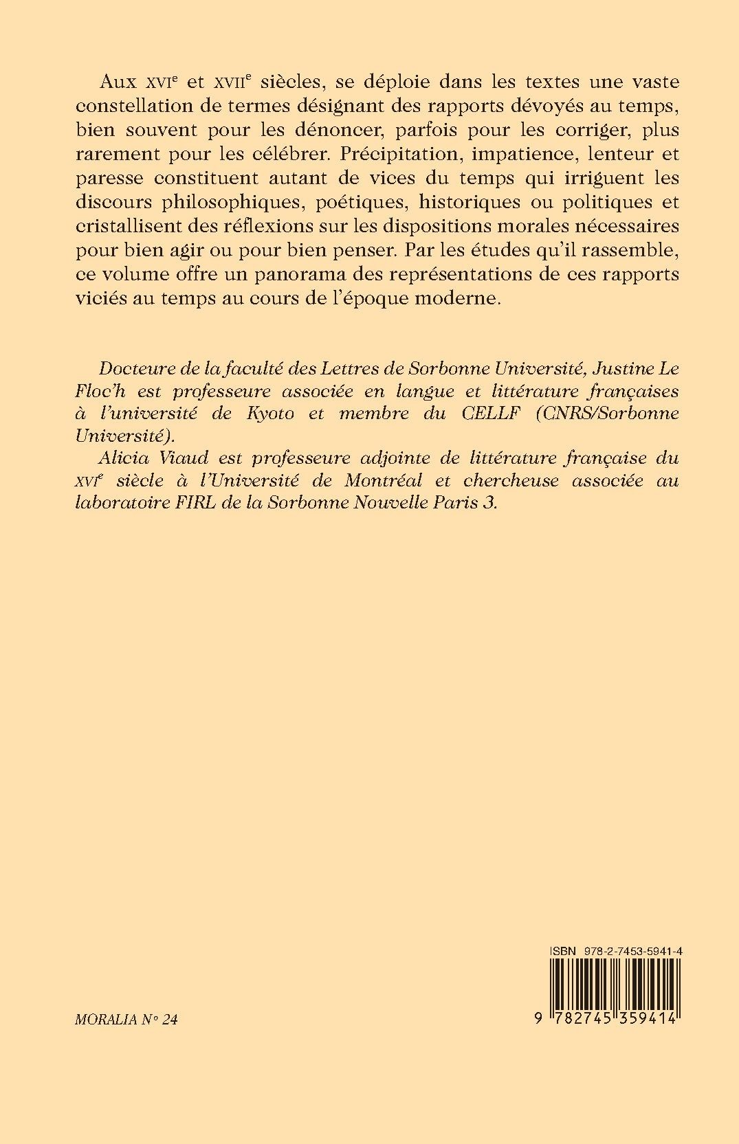 Aux XVIe et XVIIe siècles, se déploie dans les textes une vaste constellation de termes désignant des rapports dévoyés au temps, bien souvent pour les dénoncer, parfois pour les corriger, plus rarement pour les célébrer. Précipitation, impatience, lenteur et paresse constituent autant de vices du temps qui irriguent les discours philosophiques, poétiques, historiques ou politiques et cristallisent des réflexions sur les dispositions morales nécessaires pour bien agir ou pour bien penser. Par les études qu’il rassemble, ce volume offre un panorama des représentations de ces rapports viciés au temps au cours de l’époque moderne.