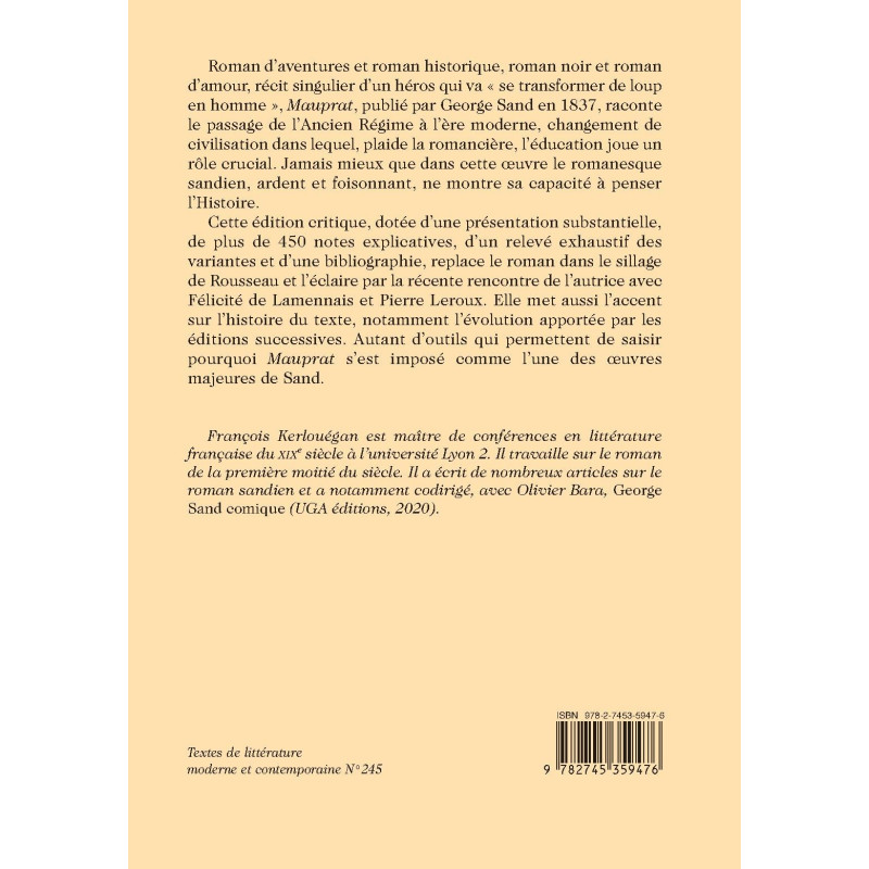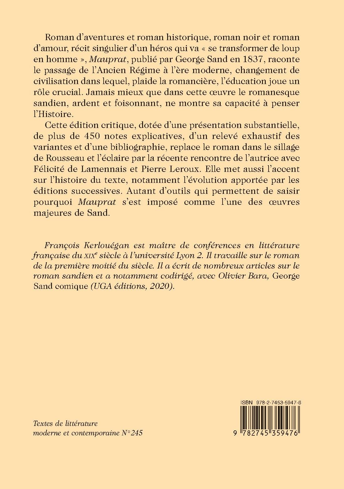Cette édition critique, dotée d’une présentation substantielle, de plus de 450 notes explicatives, d’un relevé exhaustif des variantes et d’une bibliographie, replace le roman dans le sillage de Rousseau et l’éclaire par la récente rencontre de l’autrice avec Félicité de Lamennais et Pierre Leroux. Elle met aussi l’accent sur l’histoire du texte, notamment l’évolution apportée par les éditions successives. Autant d’outils qui permettent de saisir pourquoi Mauprat s’est imposé comme l’une des œuvres majeures de Sand.