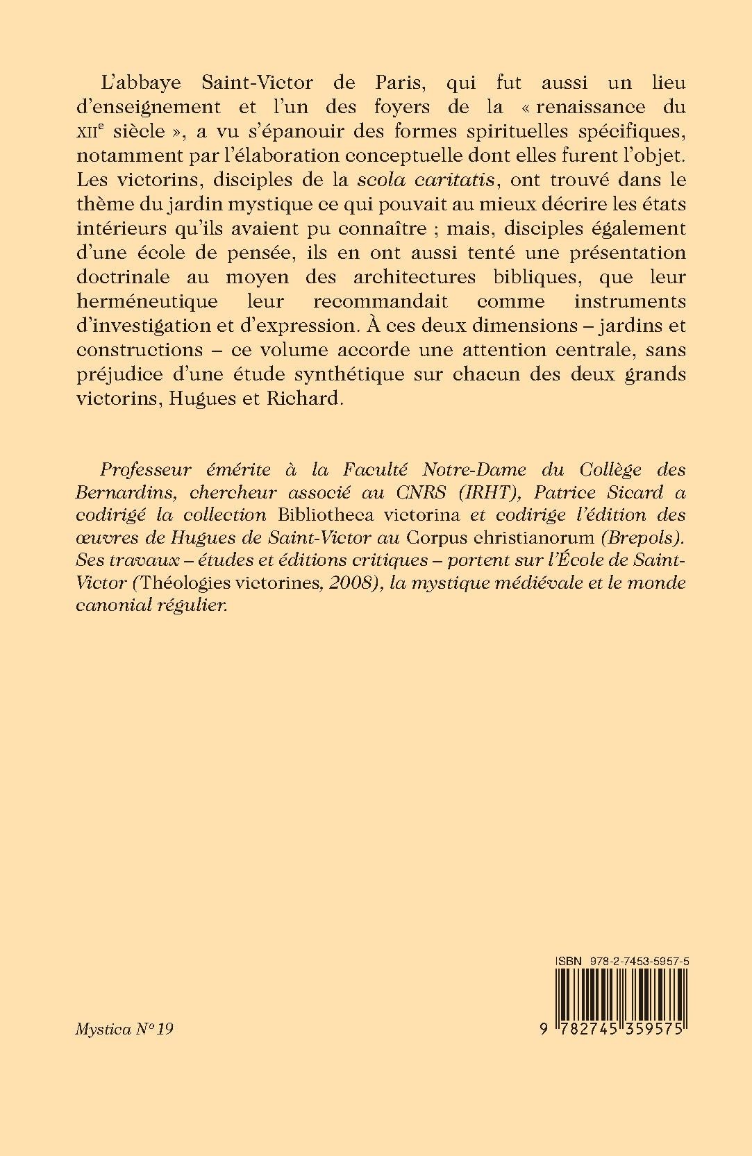 L’abbaye Saint-Victor de Paris, qui fut aussi un lieu d’enseignement et l’un des foyers de la « renaissance du XIIe siècle », a vu s’épanouir des formes spirituelles spécifiques, notamment par l’élaboration conceptuelle dont elles furent l’objet. Les victorins, disciples de la scola caritatis, ont trouvé dans le thème du jardin mystique ce qui pouvait au mieux décrire les états intérieurs qu’ils avaient pu connaître ; mais, disciples également d’une école de pensée, ils en ont aussi tenté une présentation doctrinale au moyen des architectures bibliques, que leur herméneutique leur recommandait comme instruments d’investigation et d’expression. À ces deux dimensions – jardins et constructions – ce volume accorde une attention centrale, sans préjudice d’une étude synthétique sur chacun des deux grands victorins, Hugues et Richard.