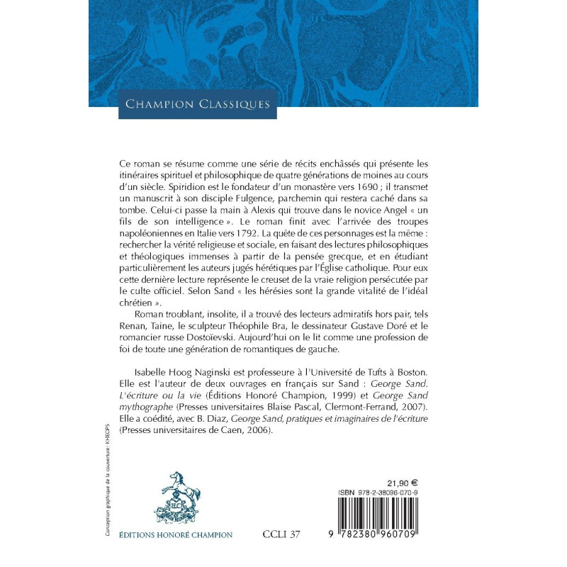 Isabelle Hoog Naginski est professeure à l'Université de Tufts à Boston. Elle est l'auteur de deux ouvrages en français sur Sand : George Sand. L'écriture ou la vie (Éditions Honoré Champion, 1999) et George Sand mythographe (Presses universitaires Blaise Pascal, Clermont-Ferrand, 2007). Elle a coédité, avec B. Diaz, George Sand, pratiques et imaginaires de l'écriture (Presses universitaires de Caen, 2006).