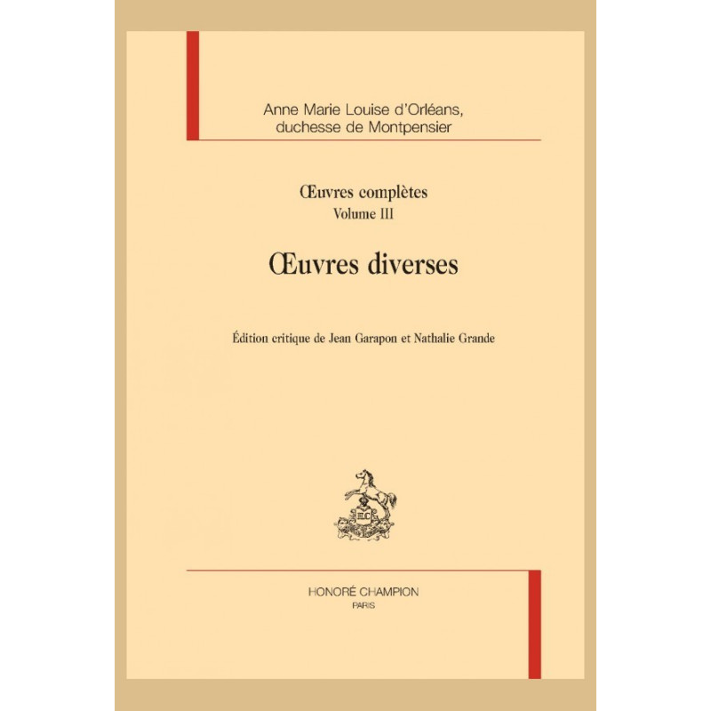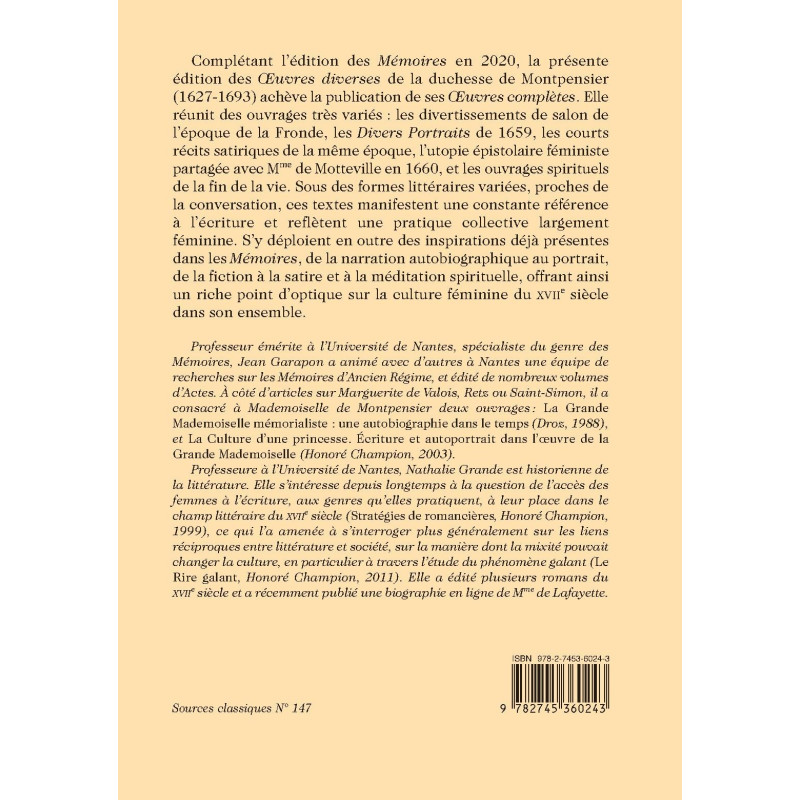 Complétant l’édition des Mémoires en 2020, la présente édition des Œuvres diverses de la duchesse de Montpensier (1627-1693) achève la publication de ses Œuvres complètes. Elle réunit des ouvrages très variés : les divertissements de salon de l’époque de la Fronde, les Divers Portraits de 1659, les courts récits satiriques de la même époque, l’utopie épistolaire féministe partagée avec Mme de Motteville en 1660, et les ouvrages spirituels de la fin de la vie. Sous des formes littéraires variées, proches de la conversation, ces textes manifestent une constante référence à l’écriture et reflètent une pratique collective largement féminine. S’y déploient en outre des inspirations déjà présentes dans les Mémoires, de la narration autobiographique au portrait, de la fiction à la satire et à la méditation spirituelle, offrant ainsi un riche point d’optique sur la culture féminine du XVIIe siècle dans son ensemble.