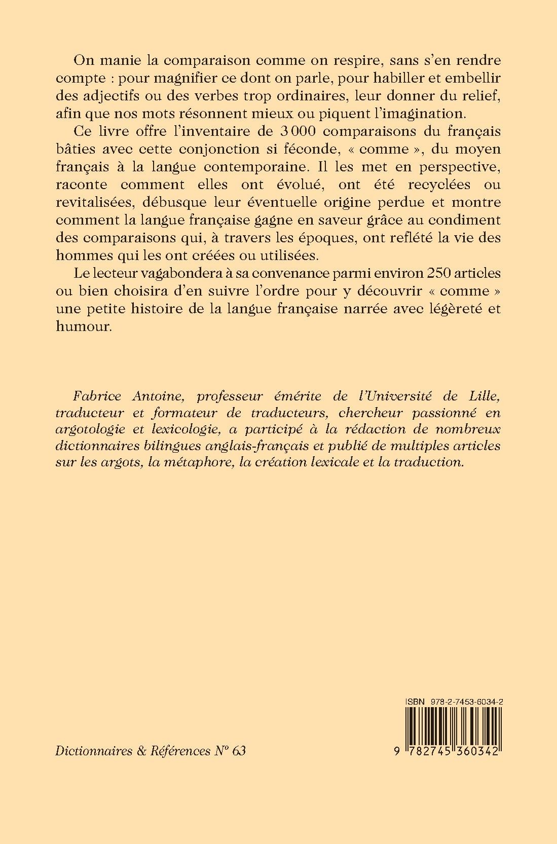 Ce livre offre l’inventaire de 3 000 comparaisons du français bâties avec cette conjonction si féconde, « comme », du moyen français à la langue contemporaine. Il les met en perspective, raconte comment elles ont évolué, ont été recyclées ou revitalisées, débusque leur éventuelle origine perdue et montre comment la langue française gagne en saveur grâce au condiment des comparaisons qui, à travers les époques, ont reflété la vie des hommes qui les ont créées ou utilisées.
