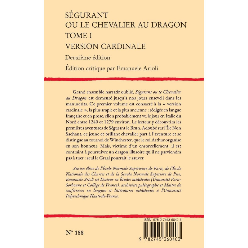 Grand ensemble narratif oublié, Ségurant ou le Chevalier au Dragon est demeuré jusqu’à nos jours enseveli dans les manuscrits. Ce premier volume est consacré à la « version cardinale », la plus ample et la plus ancienne : rédigée en langue française et en prose, elle a probablement vu le jour en Italie du Nord entre 1240 et 1279 environ. Le lecteur y découvrira les premières aventures de Ségurant le Brun. Adoubé sur l’Île Non Sachant, ce jeune et brillant chevalier part à l’aventure et se distingue au tournoi de Winchester, que le roi Arthur organise en son honneur. Mais, victime d’un ensorcellement, il est contraint à poursuivre un dragon illusoire qu’il ne parviendra pas à tuer : seul le Graal pourrait le sauver.