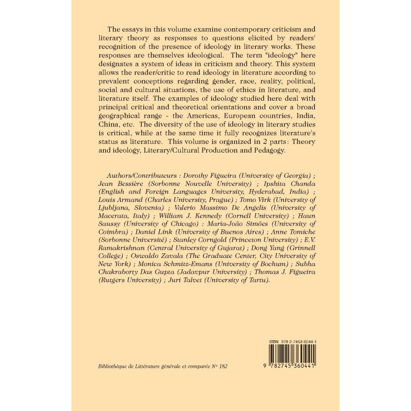 The essays in this volume examine contemporary criticism and literary theory as responses to questions elicited by readers' recognition of the presence of ideology in literary works. These responses are themselves ideological. The term "ideology" here designates a system of ideas in criticism and theory. This system allows the reader/critic to read ideology in literature according to prevalent conceptions regarding gender, race, reality, political, social and cultural situations, the use of ethics in literature, and literature itself. The examples of ideology studied here deal with principal critical and theoretical orientations and cover a broad geographical range - the Americas, European countries, India, China, etc. The diversity of the use of ideology in literary studies is critical, while at the same time it fully recognizes literature's status as literature. This volume is organized in 2 parts: Theory and ideology, Literary/Cultural Production and Pedagogy.