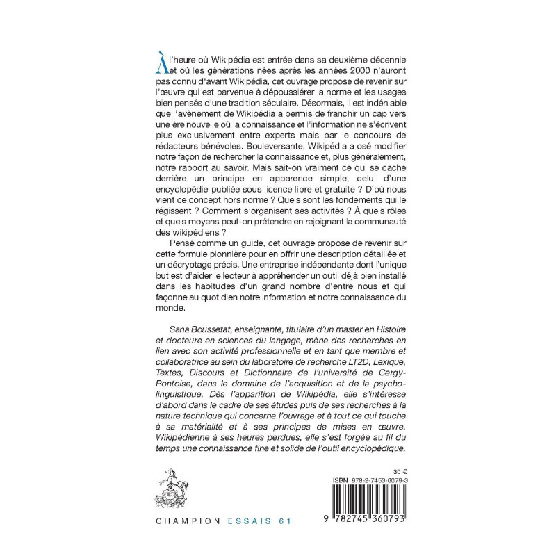 À l’heure où Wikipédia est entrée dans sa deuxième décennie et où les générations nées après les années 2000 n’auront pas connu d'avant Wikipédia, cet ouvrage propose de revenir sur l’œuvre qui est parvenue à dépoussiérer la norme et les usages bien pensés d’une tradition séculaire. Désormais, il est indéniable que l’avènement de Wikipédia a permis de franchir un cap vers une ère nouvelle où la connaissance et l’information ne s’écrivent plus exclusivement entre experts mais par le concours de rédacteurs bénévoles. Bouleversante, Wikipédia a osé modifier notre façon de rechercher la connaissance et, plus généralement, notre rapport au savoir. Mais sait-on vraiment ce qui se cache derrière un principe en apparence simple, celui d’une encyclopédie publiée sous licence libre et gratuite ? D’où nous vient ce concept hors norme ? Quels sont les fondements qui le régissent ? Comment s’organisent ses activités ? À quels rôles et quels moyens peut-on prétendre en rejoignant la communauté des wikipédiens ?
