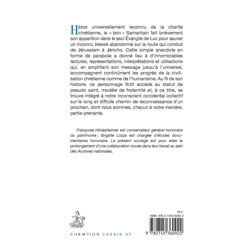 Héros universellement reconnu de la charité chrétienne, le « bon » Samaritain fait brièvement son apparition dans le seul Évangile de Luc pour sauver un inconnu blessé abandonné sur la route qui conduit de Jérusalem à Jéricho. Cette simple anecdote en forme de parabole a donné lieu à d’innombrables lectures, représentations, interprétations et utilisations qui, en amplifiant son message jusqu’à l’universel, accompagnent continûment les progrès de la civilisation chrétienne comme de l’humanisme. Au fil de son histoire, ce personnage fictif accède au statut de pseudo saint, modèle de fraternité et, à ce titre, se trouve intégré à notre inconscient occidental collectif sur le long et difficile chemin de reconnaissance d’un prochain, dont nous sommes, chacun à notre manière, partie-prenante.