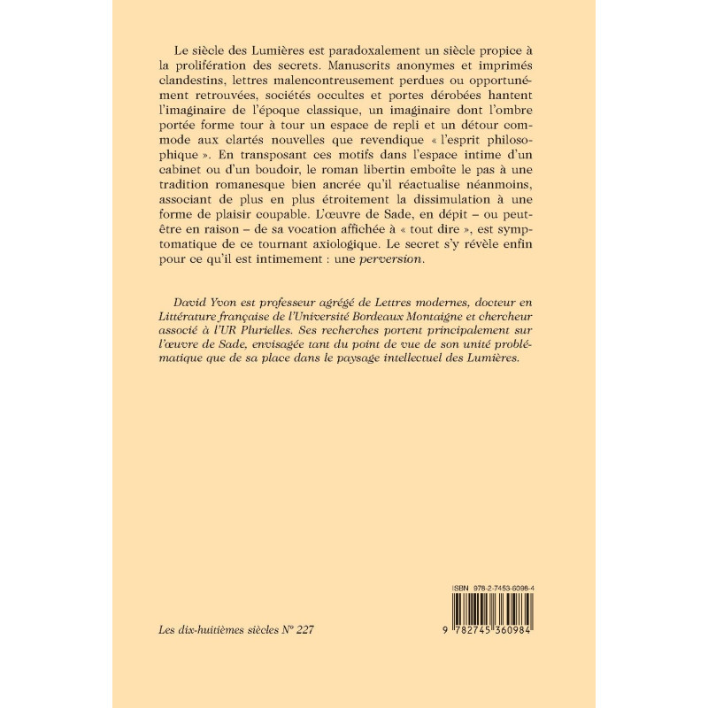 Le siècle des Lumières est paradoxalement un siècle propice à la prolifération des secrets. Manuscrits anonymes et imprimés clandestins, lettres malencontreusement perdues ou opportunément retrouvées, sociétés occultes et portes dérobées hantent l’imaginaire de l’époque classique, un imaginaire dont l’ombre portée forme tour à tour un espace de repli et un détour commode aux clartés nouvelles que revendique « l’esprit philosophique ». En transposant ces motifs dans l’espace intime d’un cabinet ou d’un boudoir, le roman libertin emboîte le pas à une tradition romanesque bien ancrée qu’il réactualise néanmoins, associant de plus en plus étroitement la dissimulation à une forme de plaisir coupable. L’œuvre de Sade, en dépit – ou peut-être en raison – de sa vocation affichée à « tout dire », est symptomatique de ce tournant axiologique. Le secret s’y révèle enfin pour ce qu’il est intimement : une perversion.