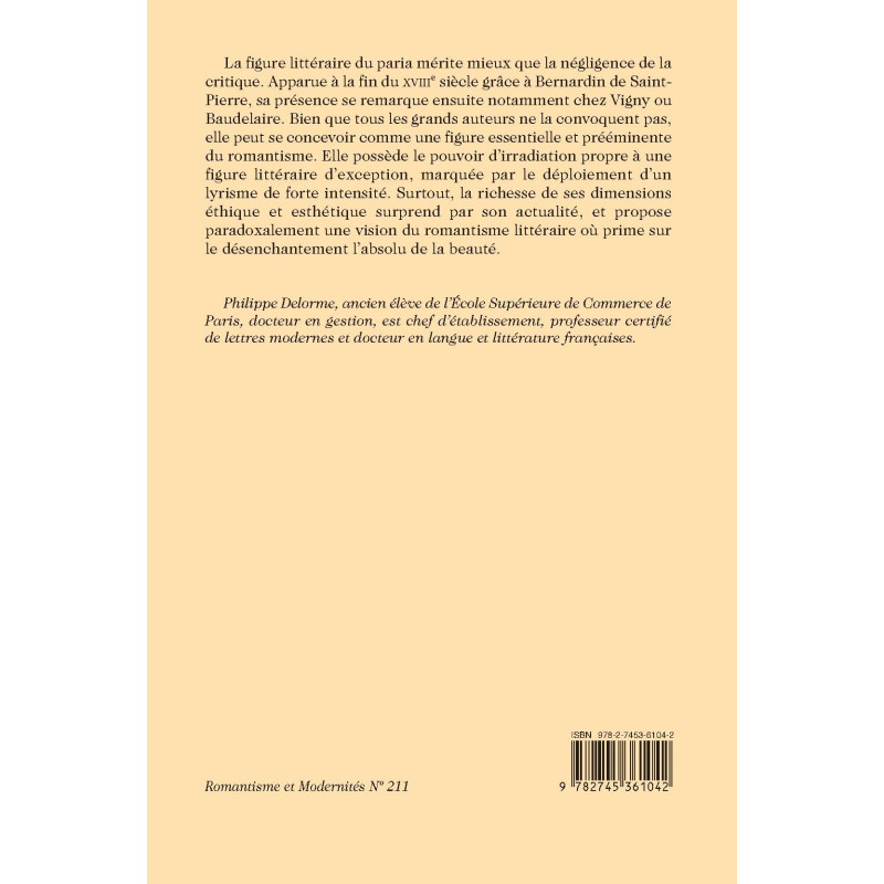 La figure littéraire du paria mérite mieux que la négligence de la critique. Apparue à la fin du XVIIIe siècle grâce à Bernardin de Saint- Pierre, sa présence se remarque ensuite notamment chez Vigny ou Baudelaire. Bien que tous les grands auteurs ne la convoquent pas, elle peut se concevoir comme une figure essentielle et prééminente du romantisme. Elle possède le pouvoir d’irradiation propre à une figure littéraire d’exception, marquée par le déploiement d’un lyrisme de forte intensité. Surtout, la richesse de ses dimensions éthique et esthétique surprend par son actualité, et propose paradoxalement une vision du romantisme littéraire où prime sur le désenchantement l’absolu de la beauté.
