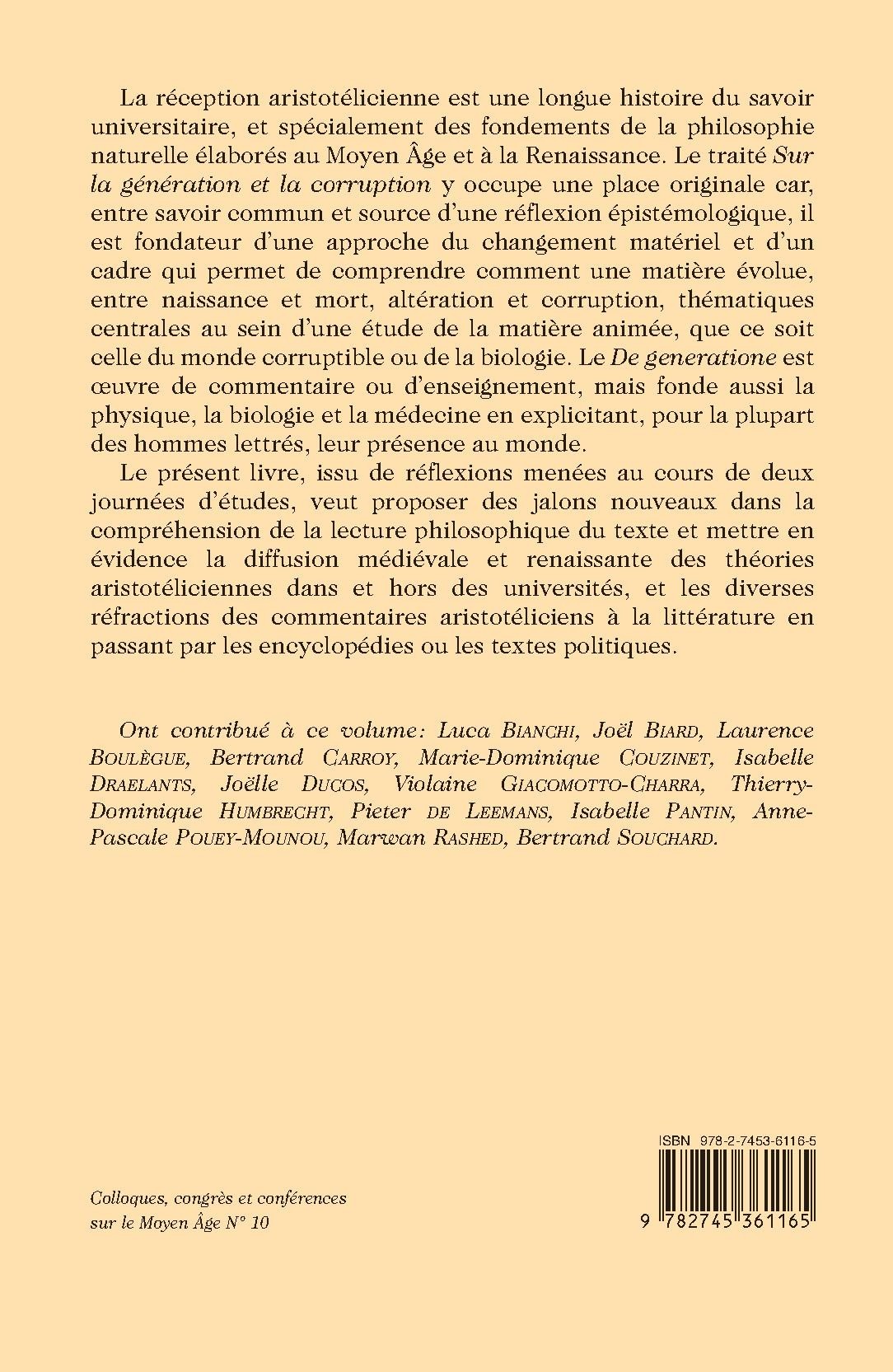 La réception aristotélicienne est une longue histoire du savoir universitaire, et spécialement des fondements de la philosophie naturelle élaborés au Moyen Âge et à la Renaissance. Le traité Sur la génération et la corruption y occupe une place originale car, entre savoir commun et source d’une réflexion épistémologique, il est fondateur d’une approche du changement matériel et d’un cadre qui permet de comprendre comment une matière évolue, entre naissance et mort, altération et corruption, thématiques centrales au sein d’une étude de la matière animée, que ce soit celle du monde corruptible ou de la biologie. Le De generatione est œuvre de commentaire ou d’enseignement, mais fonde aussi la physique, la biologie et la médecine en explicitant, pour la plupart des hommes lettrés, leur présence au monde.
