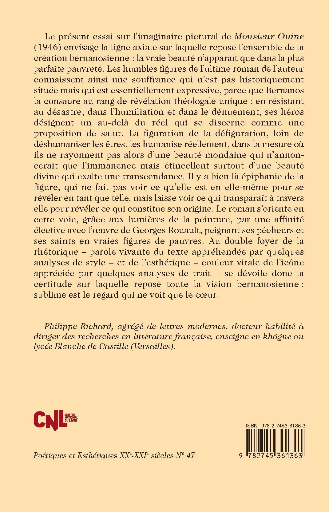 Le présent essai sur l’imaginaire pictural de Monsieur Ouine (1946) envisage la ligne axiale sur laquelle repose l’ensemble de la création bernanosienne : la vraie beauté n’apparaît que dans la plus parfaite pauvreté. Les humbles figures de l’ultime roman de l’auteur connaissent ainsi une souffrance qui n’est pas historiquement située mais qui est essentiellement expressive, parce que Bernanos la consacre au rang de révélation théologale unique : en résistant au désastre, dans l’humiliation et dans le dénuement, ses héros désignent un au-delà du réel qui se discerne comme une proposition de salut. La figuration de la défiguration, loin de déshumaniser les êtres, les humanise réellement, dans la mesure où ils ne rayonnent pas alors d’une beauté mondaine qui n’annoncerait que l’immanence mais étincellent surtout d’une beauté divine qui exalte une transcendance. Il y a bien là épiphanie de la figure, qui ne fait pas voir ce qu’elle est en elle-même pour se révéler en tant que telle, mais laisse voir ce qui transparaît à travers elle pour révéler ce qui constitue son origine. Le roman s’oriente en cette voie, grâce aux lumières de la peinture, par une affinité élective avec l’œuvre de Georges Rouault, peignant ses pécheurs et ses saints en vraies figures de pauvres. Au double foyer de la rhétorique – parole vivante du texte appréhendée par quelques analyses de style – et de l’esthétique – couleur vitale de l’icône appréciée par quelques analyses de trait – se dévoile donc la certitude sur laquelle repose toute la vision bernanosienne : sublime est le regard qui ne voit que le cœur.