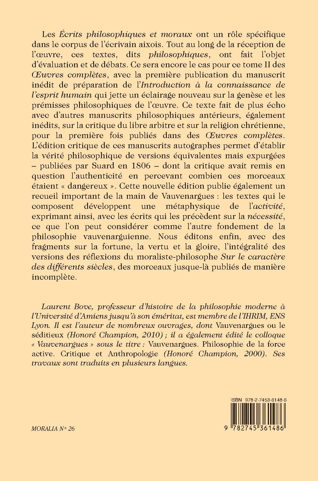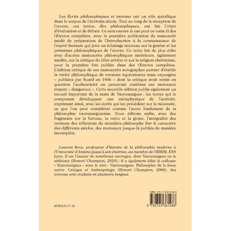 Les Écrits philosophiques et moraux ont un rôle spécifique dans le corpus de l’écrivain aixois. Tout au long de la réception de l’œuvre, ces textes, dits philosophiques, ont fait l’objet d’évaluation et de débats. Ce sera encore le cas pour ce tome II des Œuvres complètes, avec la première publication du manuscrit inédit de préparation de l’Introduction à la connaissance de l’esprit humain qui jette un éclairage nouveau sur la genèse et les prémisses philosophiques de l’œuvre. Ce texte fait de plus écho avec d’autres manuscrits philosophiques antérieurs, également inédits, sur la critique du libre arbitre et sur la religion chrétienne, pour la première fois publiés dans des Œuvres complètes. L’édition critique de ces manuscrits autographes permet d’établir la vérité philosophique de versions équivalentes mais expurgées – publiées par Suard en 1806 – dont la critique avait remis en question l’authenticité en percevant combien ces morceaux étaient « dangereux ». Cette nouvelle édition publie également un recueil important de la main de Vauvenargues : les textes qui le composent développent une métaphysique de l’activité, exprimant ainsi, avec les écrits qui les précèdent sur la nécessité, ce que l’on peut considérer comme l’autre fondement de la philosophie vauvenarguienne. Nous éditons enfin, avec des fragments sur la fortune, la vertu et la gloire, l’intégralité des versions des réflexions du moraliste-philosophe Sur le caractère des différents siècles, des morceaux jusque-là publiés de manière incomplète.