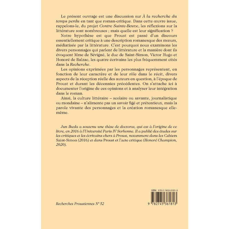 Jun Ikeda a soutenu une thèse de doctorat, qui est à l’origine de ce livre, en 2016 à l’Université Paris IV Sorbonne. Il a publié des études sur les critiques et les écrivains chers à Proust, notamment dans les Cahiers Saint-Simon (2016) et dans Proust et l’acte critique (Honoré Champion, 2020).