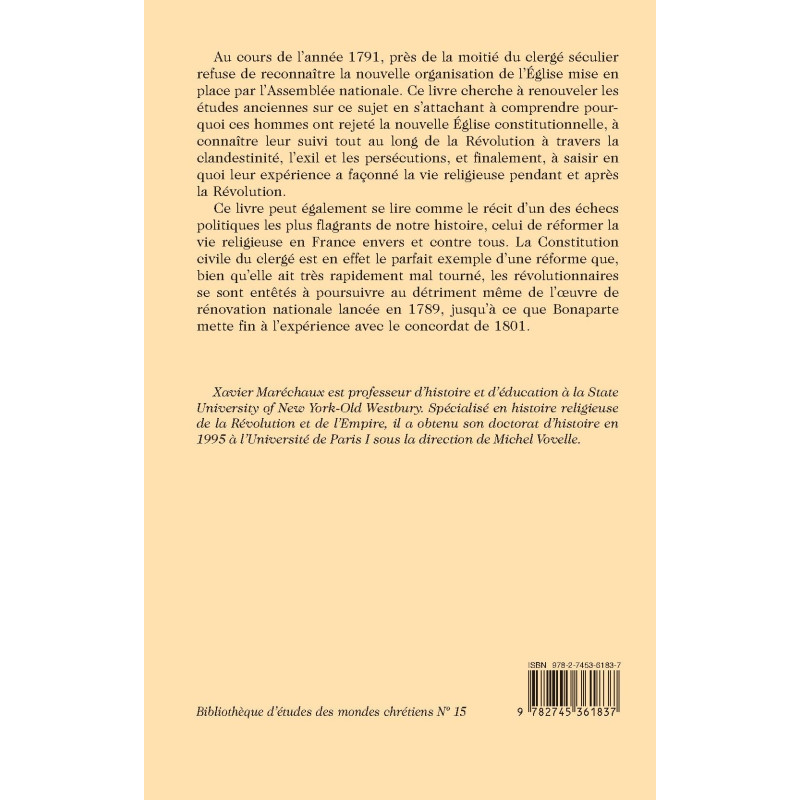 Au cours de l’année 1791, près de la moitié du clergé séculier refuse de reconnaître la nouvelle organisation de l’Église mise en place par l’Assemblée nationale. Ce livre cherche à renouveler les études anciennes sur ce sujet en s’attachant à comprendre pourquoi ces hommes ont rejeté la nouvelle Église constitutionnelle, à connaître leur suivi tout au long de la Révolution à travers la clandestinité, l’exil et les persécutions, et finalement, à saisir en quoi leur expérience a façonné la vie religieuse pendant et après la Révolution.