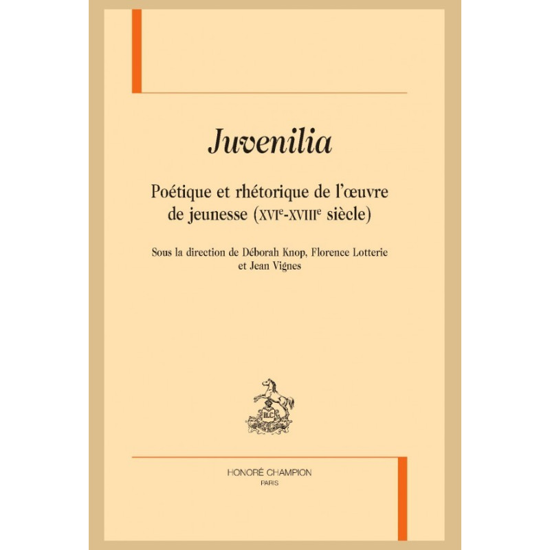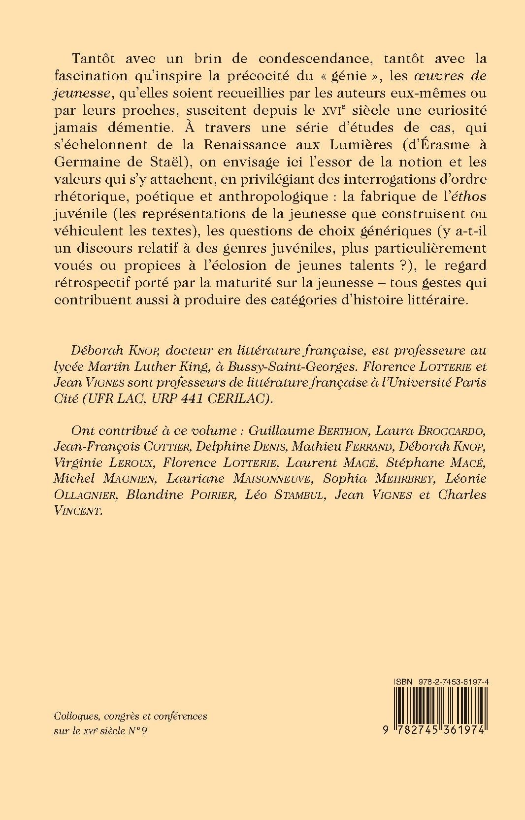 Tantôt avec un brin de condescendance, tantôt avec la fascination qu’inspire la précocité du « génie », les œuvres de jeunesse, qu’elles soient recueillies par les auteurs eux-mêmes ou par leurs proches, suscitent depuis le XVIe siècle une curiosité jamais démentie. À travers une série d’études de cas, qui s’échelonnent de la Renaissance aux Lumières (d’Érasme à Germaine de Staël), on envisage ici l’essor de la notion et les valeurs qui s’y attachent, en privilégiant des interrogations d’ordre rhétorique, poétique et anthropologique : la fabrique de l’éthos juvénile (les représentations de la jeunesse que construisent ou véhiculent les textes), les questions de choix génériques (y a-t-il un discours relatif à des genres juvéniles, plus particulièrement voués ou propices à l’éclosion de jeunes talents ?), le regard rétrospectif porté par la maturité sur la jeunesse – tous gestes qui contribuent aussi à produire des catégories d’histoire littéraire.