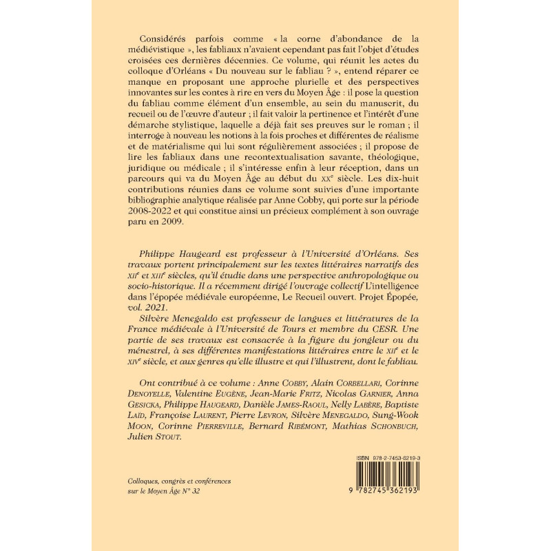 Considérés parfois comme « la corne d’abondance de la médiévistique », les fabliaux n’avaient cependant pas fait l’objet d’études croisées ces dernières décennies. Ce volume, qui réunit les actes du colloque d’Orléans « Du nouveau sur le fabliau ? », entend réparer ce manque en proposant une approche plurielle et des perspectives innovantes sur les contes à rire en vers du Moyen Âge : il pose la question du fabliau comme élément d’un ensemble, au sein du manuscrit, du recueil ou de l’œuvre d’auteur ; il fait valoir la pertinence et l’intérêt d’une démarche stylistique, laquelle a déjà fait ses preuves sur le roman ; il interroge à nouveau les notions à la fois proches et différentes de réalisme et de matérialisme qui lui sont régulièrement associées ; il propose de lire les fabliaux dans une recontextualisation savante, théologique, juridique ou médicale ; il s’intéresse enfin à leur réception, dans un parcours qui va du Moyen Âge au début du XXe siècle. Les dix-huit contributions réunies dans ce volume sont suivies d’une importante bibliographie analytique réalisée par Anne Cobby, qui porte sur la période 2008-2022 et qui constitue ainsi un précieux complément à son ouvrage paru en 2009.