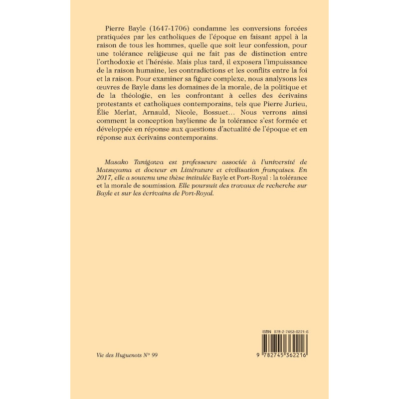 Masako Tanigawa est professeure associée à l’université de Matsuyama et docteur en Littérature et civilisation françaises. En 2017, elle a soutenu une thèse intitulée Bayle et Port-Royal : la tolérance et la morale de soumission. Elle poursuit des travaux de recherche sur Bayle et sur les écrivains de Port-Royal.