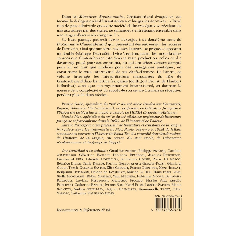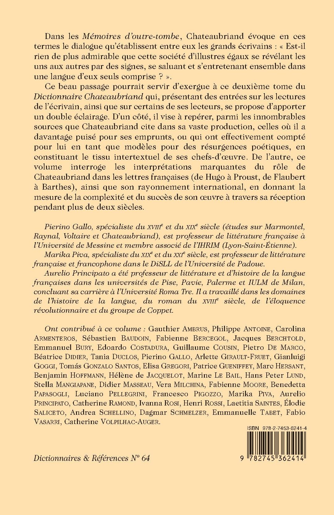 Ce beau passage pourrait servir d’exergue à ce deuxième tome du Dictionnaire Chateaubriand qui, présentant des entrées sur les lectures de l’écrivain, ainsi que sur certains de ses lecteurs, se propose d’apporter un double éclairage. D’un côté, il vise à repérer, parmi les innombrables sources que Chateaubriand cite dans sa vaste production, celles où il a davantage puisé pour ses emprunts, ou qui ont effectivement compté pour lui en tant que modèles pour des résurgences poétiques, en constituant le tissu intertextuel de ses chefs-d’œuvre. De l’autre, ce volume interroge les interprétations marquantes du rôle de Chateaubriand dans les lettres françaises (de Hugo à Proust, de Flaubert à Barthes), ainsi que son rayonnement international, en donnant la mesure de la complexité et du succès de son œuvre à travers sa réception pendant plus de deux siècles.