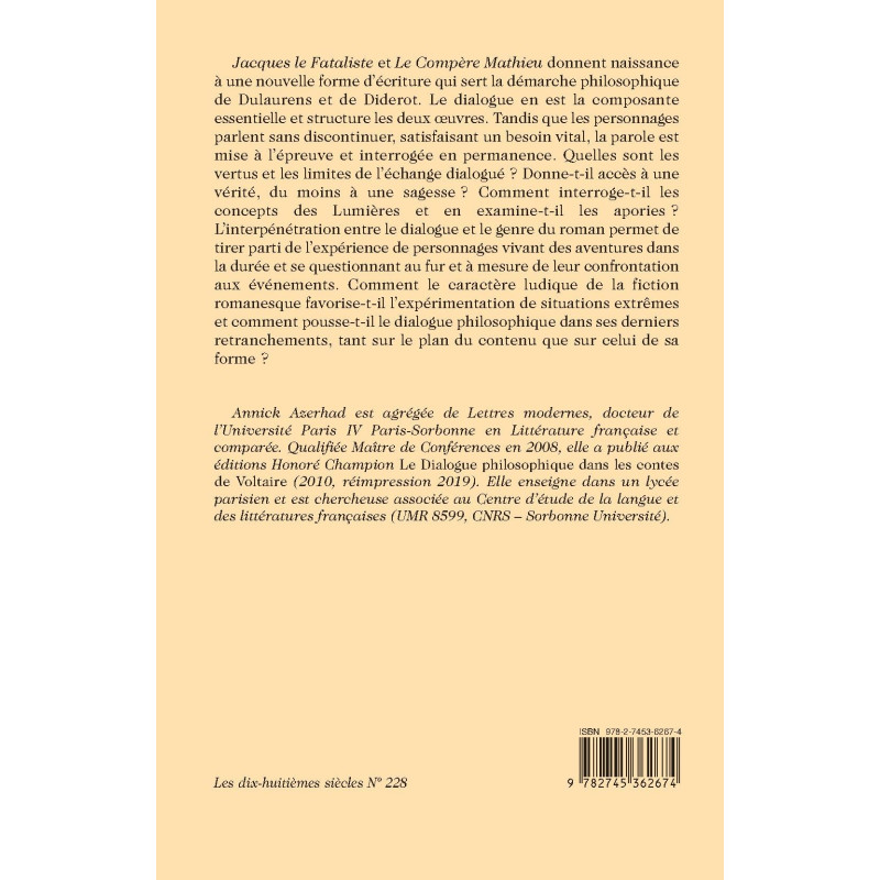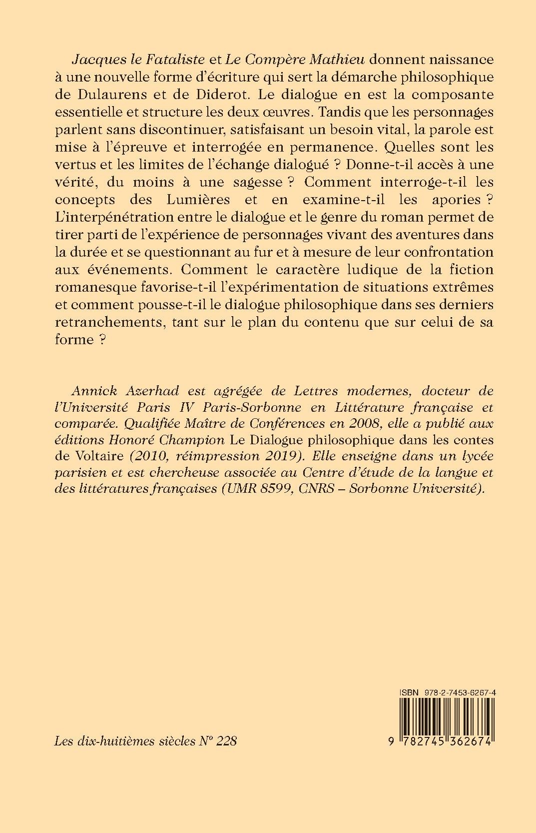 Jacques le Fataliste et Le Compère Mathieu donnent naissance à une nouvelle forme d’écriture qui sert la démarche philosophique de Dulaurens et de Diderot. Le dialogue en est la composante essentielle et structure les deux œuvres. Tandis que les personnages parlent sans discontinuer, satisfaisant un besoin vital, la parole est mise à l’épreuve et interrogée en permanence. Quelles sont les vertus et les limites de l’échange dialogué ? Donne-t-il accès à une vérité, du moins à une sagesse ? Comment interroge-t-il les concepts des Lumières et en examine-t-il les apories ? L’interpénétration entre le dialogue et le genre du roman permet de tirer parti de l’expérience de personnages vivant des aventures dans la durée et se questionnant au fur et à mesure de leur confrontation aux événements. Comment le caractère ludique de la fiction romanesque favorise-t-il l’expérimentation de situations extrêmes et comment pousse-t-il le dialogue philosophique dans ses derniers retranchements, tant sur le plan du contenu que sur celui de sa forme ?