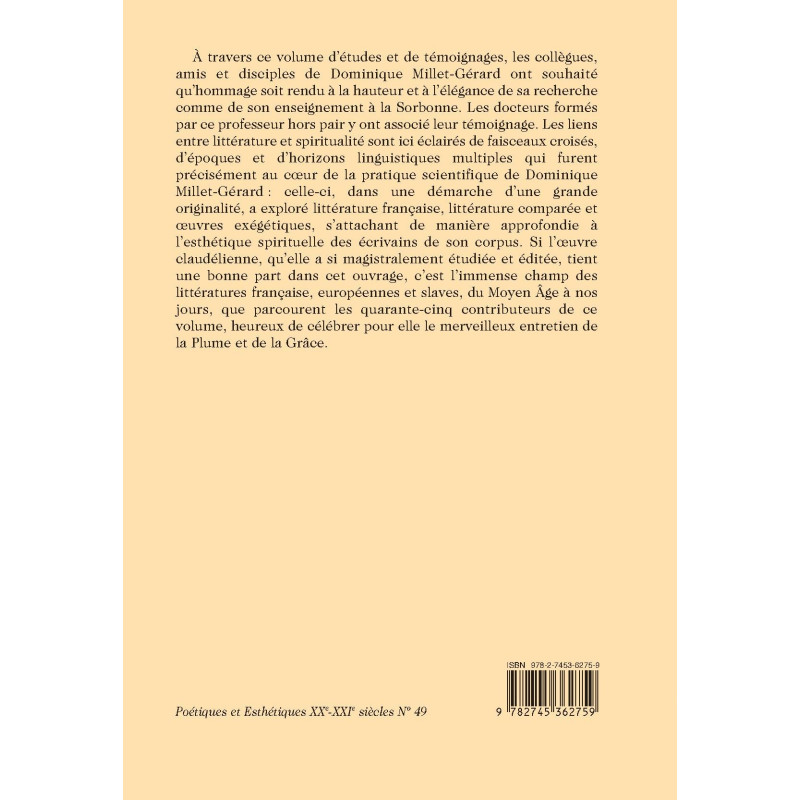 À travers ce volume d’études et de témoignages, les collègues, amis et disciples de Dominique Millet-Gérard ont souhaité qu’hommage soit rendu à la hauteur et à l’élégance de sa recherche comme de son enseignement à la Sorbonne. Les docteurs formés par ce professeur hors pair y ont associé leur témoignage. Les liens entre littérature et spiritualité sont ici éclairés de faisceaux croisés, d’époques et d’horizons linguistiques multiples qui furent précisément au cœur de la pratique scientifique de Dominique Millet-Gérard : celle-ci, dans une démarche d’une grande originalité, a exploré littérature française, littérature comparée et œuvres exégétiques, s’attachant de manière approfondie à l’esthétique spirituelle des écrivains de son corpus. Si l’œuvre claudélienne, qu’elle a si magistralement étudiée et éditée, tient une bonne part dans cet ouvrage, c’est l’immense champ des littératures française, européennes et slaves, du Moyen Âge à nos jours, que parcourent les quarante-cinq contributeurs de ce volume, heureux de célébrer pour elle le merveilleux entretien de la Plume et de la Grâce.
