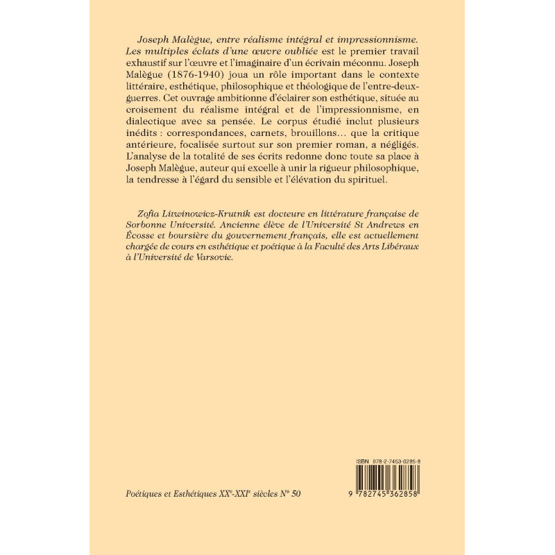 Joseph Malègue, entre réalisme intégral et impressionnisme. Les multiples éclats d’une œuvre oubliée est le premier travail exhaustif sur l’œuvre et l’imaginaire d’un écrivain méconnu. Joseph Malègue (1876-1940) joua un rôle important dans le contexte littéraire, esthétique, philosophique et théologique de l’entre-deux-guerres. Cet ouvrage ambitionne d’éclairer son esthétique, située au croisement du réalisme intégral et de l’impressionnisme, en dialectique avec sa pensée. Le corpus étudié inclut plusieurs inédits : correspondances, carnets, brouillons… que la critique antérieure, focalisée surtout sur son premier roman, a négligés. L’analyse de la totalité de ses écrits redonne donc toute sa place à Joseph Malègue, auteur qui excelle à unir la rigueur philosophique, la tendresse à l’égard du sensible et l’élévation du spirituel.