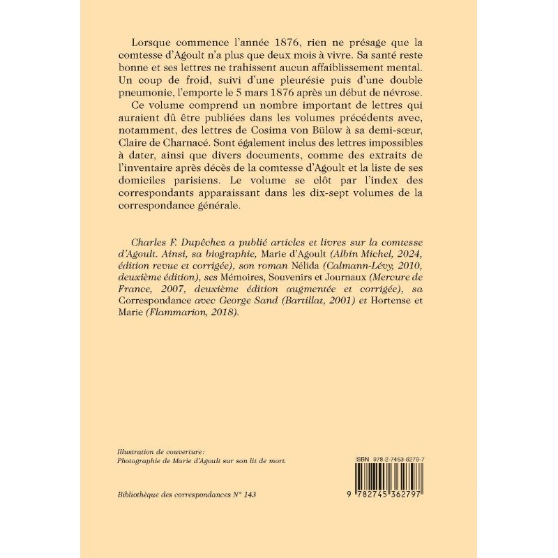 Ce volume comprend un nombre important de lettres qui auraient dû être publiées dans les volumes précédents avec, notamment, des lettres de Cosima von Bülow à sa demi-sœur, Claire de Charnacé. Sont également inclus des lettres impossibles à dater, ainsi que divers documents, comme des extraits de l’inventaire après décès de la comtesse d’Agoult et la liste de ses domiciles parisiens. Le volume se clôt par l’index des correspondants apparaissant dans les dix-sept volumes de la correspondance générale.