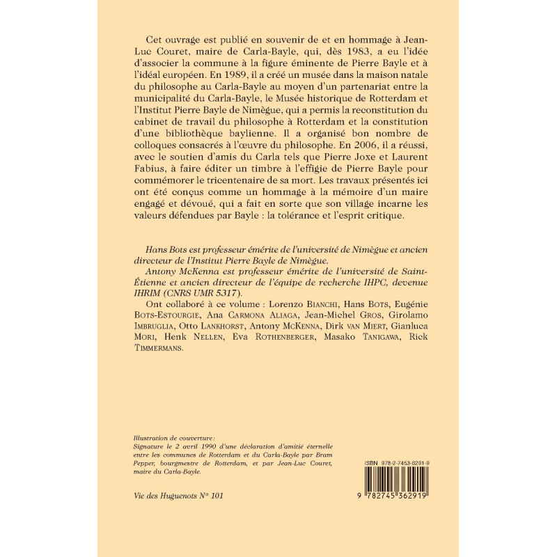 Cet ouvrage est publié en souvenir de et en hommage à Jean- Luc Couret, maire de Carla-Bayle, qui, dès 1983, a eu l’idée d’associer la commune à la figure éminente de Pierre Bayle et à l’idéal européen. En 1989, il a créé un musée dans la maison natale du philosophe au Carla-Bayle au moyen d’un partenariat entre la municipalité du Carla-Bayle, le Musée historique de Rotterdam et l’Institut Pierre Bayle de Nimègue, qui a permis la reconstitution du cabinet de travail du philosophe à Rotterdam et la constitution d’une bibliothèque baylienne. Il a organisé bon nombre de colloques consacrés à l’œuvre du philosophe. En 2006, il a réussi, avec le soutien d’amis du Carla tels que Pierre Joxe et Laurent Fabius, à faire éditer un timbre à l’effigie de Pierre Bayle pour commémorer le tricentenaire de sa mort. Les travaux présentés ici ont été conçus comme un hommage à la mémoire d’un maire engagé et dévoué, qui a fait en sorte que son village incarne les valeurs défendues par Bayle : la tolérance et l’esprit critique.