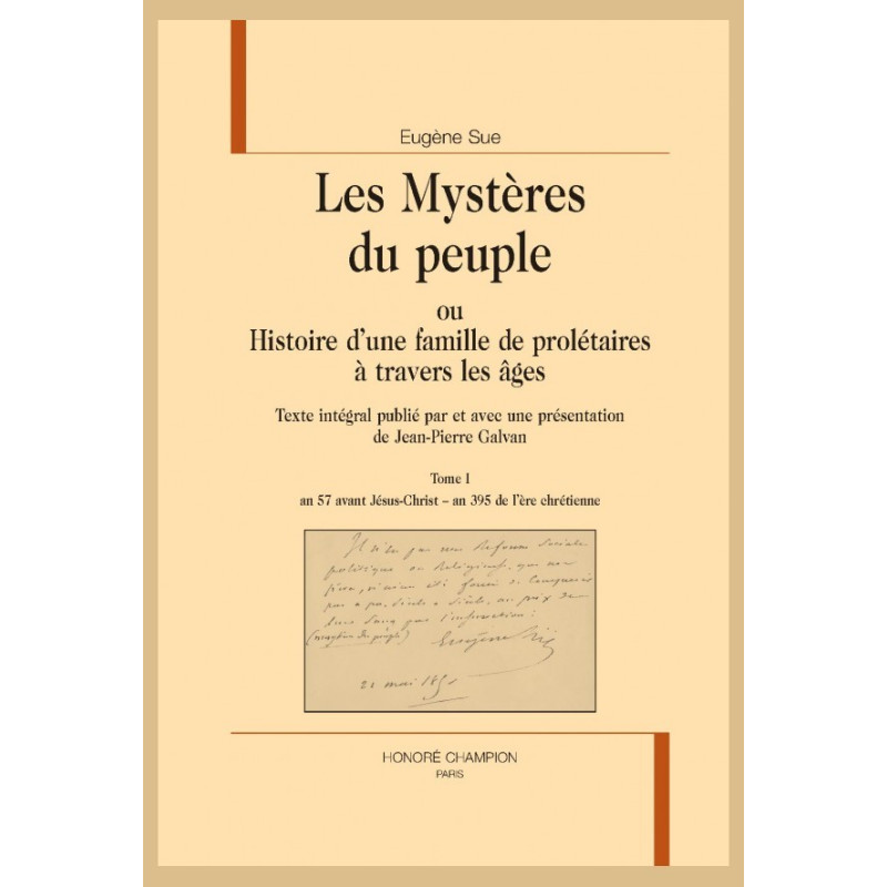 En présentant et expliquant dans ses lettres aux abonnés les événements du passé sous cet angle, Eugène Sue fait des Mystères du peuple un ouvrage de pédagogie militante destiné à éclairer les lecteurs sur les origines d’une lutte qui se poursuit encore à l’heure où ils les lisent. Ouvrage jugé dangereux par le gouvernement impérial, Les Mystères du peuple ne purent paraître en feuilleton. La distribution en livraisons à des abonnés connut de nombreuses entraves avant d’être définitivement interdite. Tout juste achevée, l’œuvre est jugée et condamnée à la destruction en septembre 1857, à l’issue du réquisitoire du tristement célèbre avocat impérial Ernest Pinard. Un mois plus tôt, Eugène Sue s’était éteint à Annecy-le-Vieux, fier d’avoir pu mener à terme un ouvrage qu’il considérait comme nécessaire à l’instruction civique du peuple et qu’il plaçait au premier rang de ses œuvres.