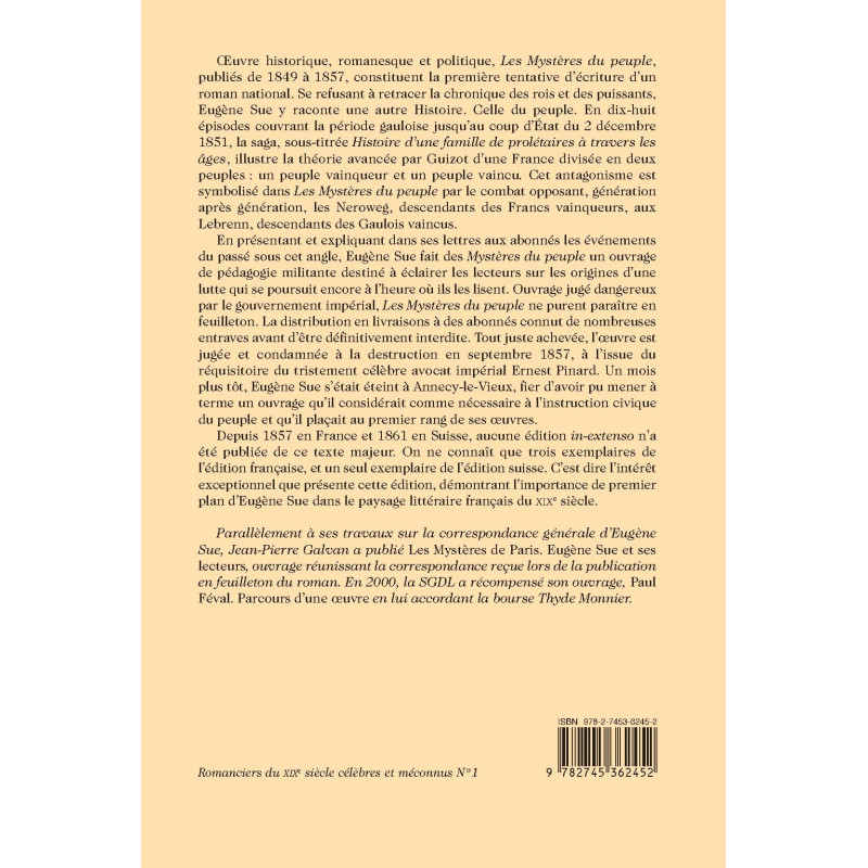 Œuvre historique, romanesque et politique, Les Mystères du peuple, publiés de 1849 à 1857, constituent la première tentative d’écriture d’un roman national. Se refusant à retracer la chronique des rois et des puissants, Eugène Sue y raconte une autre Histoire. Celle du peuple. En dix-huit épisodes couvrant la période gauloise jusqu’au coup d’État du 2 décembre 1851, la saga, sous-titrée Histoire d’une famille de prolétaires à travers les âges, illustre la théorie avancée par Guizot d’une France divisée en deux peuples : un peuple vainqueur et un peuple vaincu. Cet antagonisme est symbolisé dans Les Mystères du peuple par le combat opposant, génération après génération, les Neroweg, descendants des Francs vainqueurs, aux Lebrenn, descendants des Gaulois vaincus.