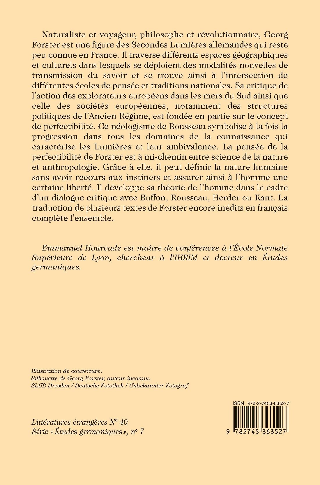 Naturaliste et voyageur, philosophe et révolutionnaire, Georg Forster est une figure des Secondes Lumières allemandes qui reste peu connue en France. Il traverse différents espaces géographiques et culturels dans lesquels se déploient des modalités nouvelles de transmission du savoir et se trouve ainsi à l’intersection de différentes écoles de pensée et traditions nationales. Sa critique de l’action des explorateurs européens dans les mers du Sud ainsi que celle des sociétés européennes, notamment des structures politiques de l’Ancien Régime, est fondée en partie sur le concept de perfectibilité. Ce néologisme de Rousseau symbolise à la fois la progression dans tous les domaines de la connaissance qui caractérise les Lumières et leur ambivalence. La pensée de la perfectibilité de Forster est à mi-chemin entre science de la nature et anthropologie. Grâce à elle, il peut définir la nature humaine sans avoir recours aux instincts et assurer ainsi à l’homme une certaine liberté. Il développe sa théorie de l’homme dans le cadre d’un dialogue critique avec Buffon, Rousseau, Herder ou Kant. La traduction de plusieurs textes de Forster encore inédits en français complète l’ensemble.