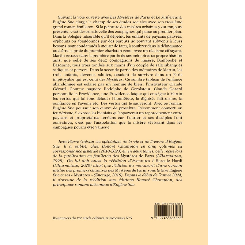 Suivant la voie ouverte avec Les Mystères de Paris et Le Juif errant, Eugène Sue élargit le champ de ses études sociales avec son troisième grand roman feuilleton. Si la peinture des misères urbaines y est toujours présente, c’est désormais celle des campagnes qui passe au premier plan. Dans la Sologne misérable qu’il dépeint, les enfants de paysans pauvres, orphelins ou abandonnés par des parents ne pouvant subvenir à leurs besoins, sont condamnés à mourir de faim, à sombrer dans la délinquance ou à être la proie du premier charlatan venu. Avec un réalisme effrayant, Martin retrace dans la première partie de ses mémoires sa propre histoire ainsi que celle de ses deux compagnons de misère, Bamboche et Basquine, tous trois tombés aux mains d’un couple de saltimbanques sadiques et pervers. Dans la seconde partie des mémoires de Martin, les trois enfants, devenus adultes, essaient de survivre dans un Paris impitoyable qui est celui des Mystères. Ce sombre tableau de l’enfance abandonnée est éclairé par un homme de bien : l’instituteur Claude Gérard. Comme naguère Rodolphe de Gerolstein, Claude Gérard personnifie la Providence, une Providence laïque qui enseigne à Martin les vertus qui lui font défaut : l’honnêteté, la dignité, l’altruisme, la confiance en l’avenir etc. Des vertus qui le sauveront. Avec ce roman, Eugène Sue poursuit son œuvre de prosélyte. Récemment converti au fouriérisme, il expose les bienfaits qu’apporterait un rapprochement entre paysans et propriétaires terriens car, Fourier et ses disciples l’ont convaincu, c’est par l’association que la misère sévissant dans les campagnes pourra être vaincue.